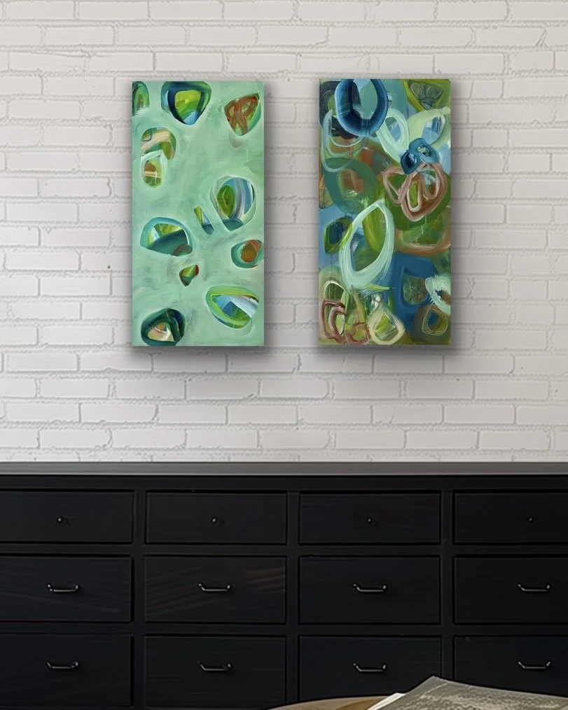 Shrouded is about veils — of fog, shadow, and dense foliage — that soften the landscape and blur the way forward. I worked intuitively, layering soft, muted tones and shapes that feel half-seen, half-remembered. It carries the hush of a misty forest morning, where outlines blur, sounds are muffled, and the air feels heavy with waiting.