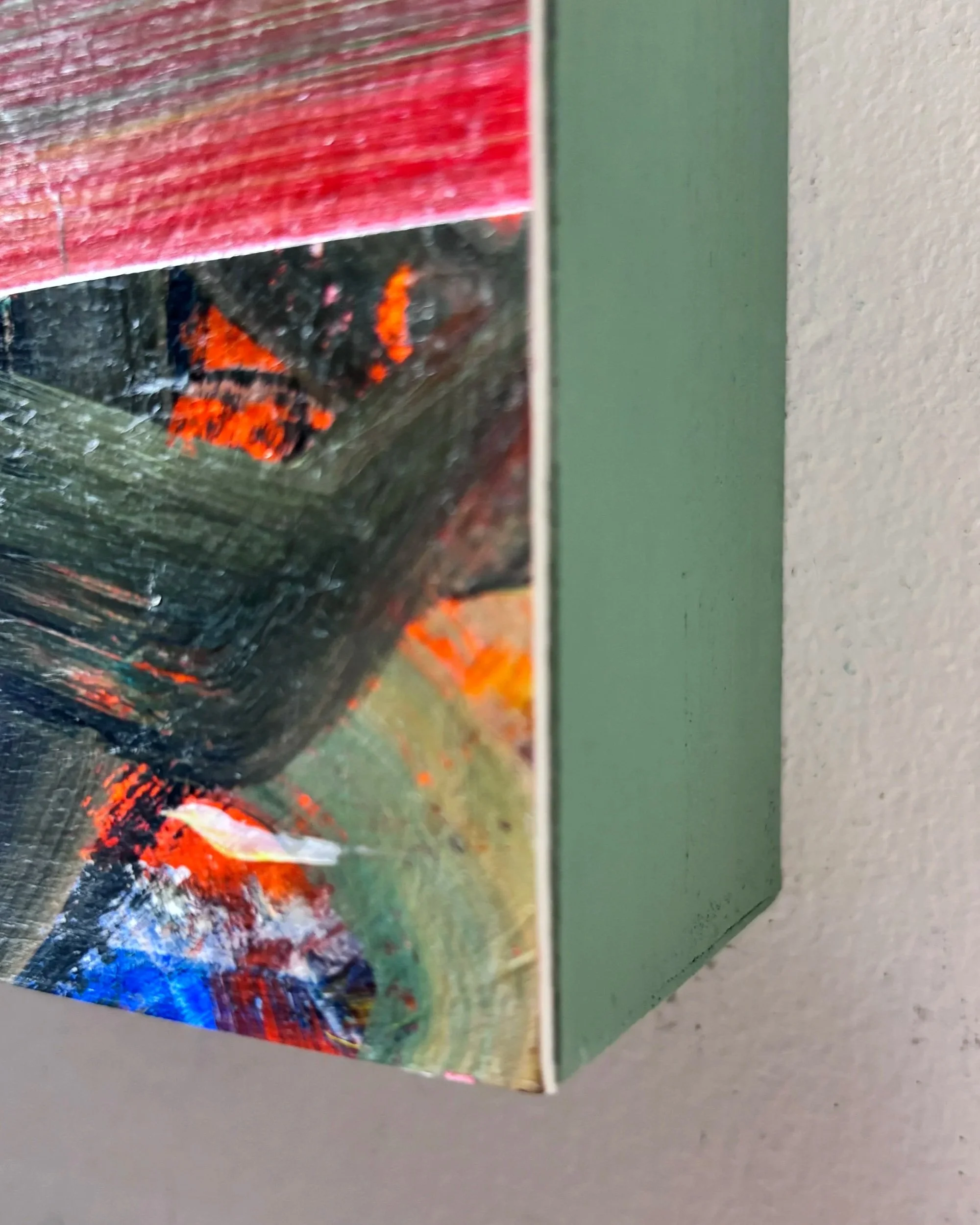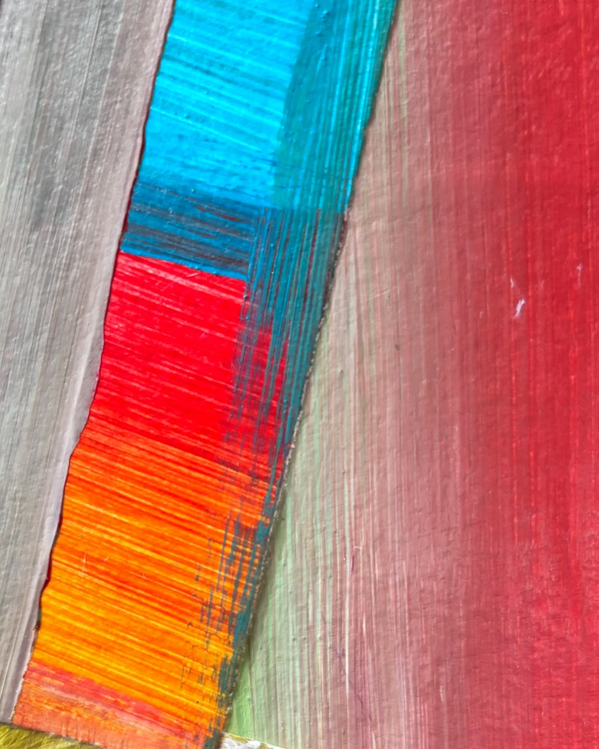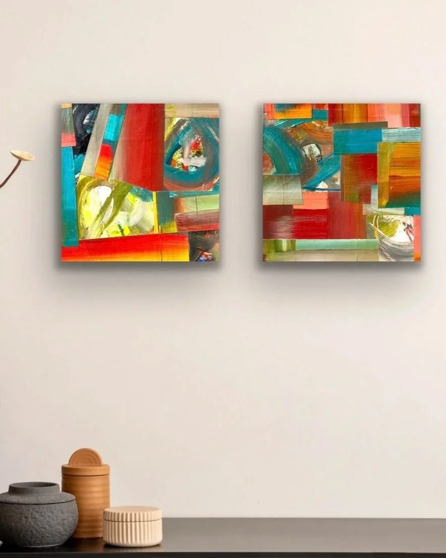 Warp & Weft pays homage to the woven foundations of cloth and the traditions of sewing—interlacing painted strips into something both sturdy and surprising. The overlapping planes of colour echo fabric laid side by side, stitched with tension and rhythm. In their meeting points, unexpected harmonies emerge: deep reds spar with cool blues, bright greens soften into neutrals.