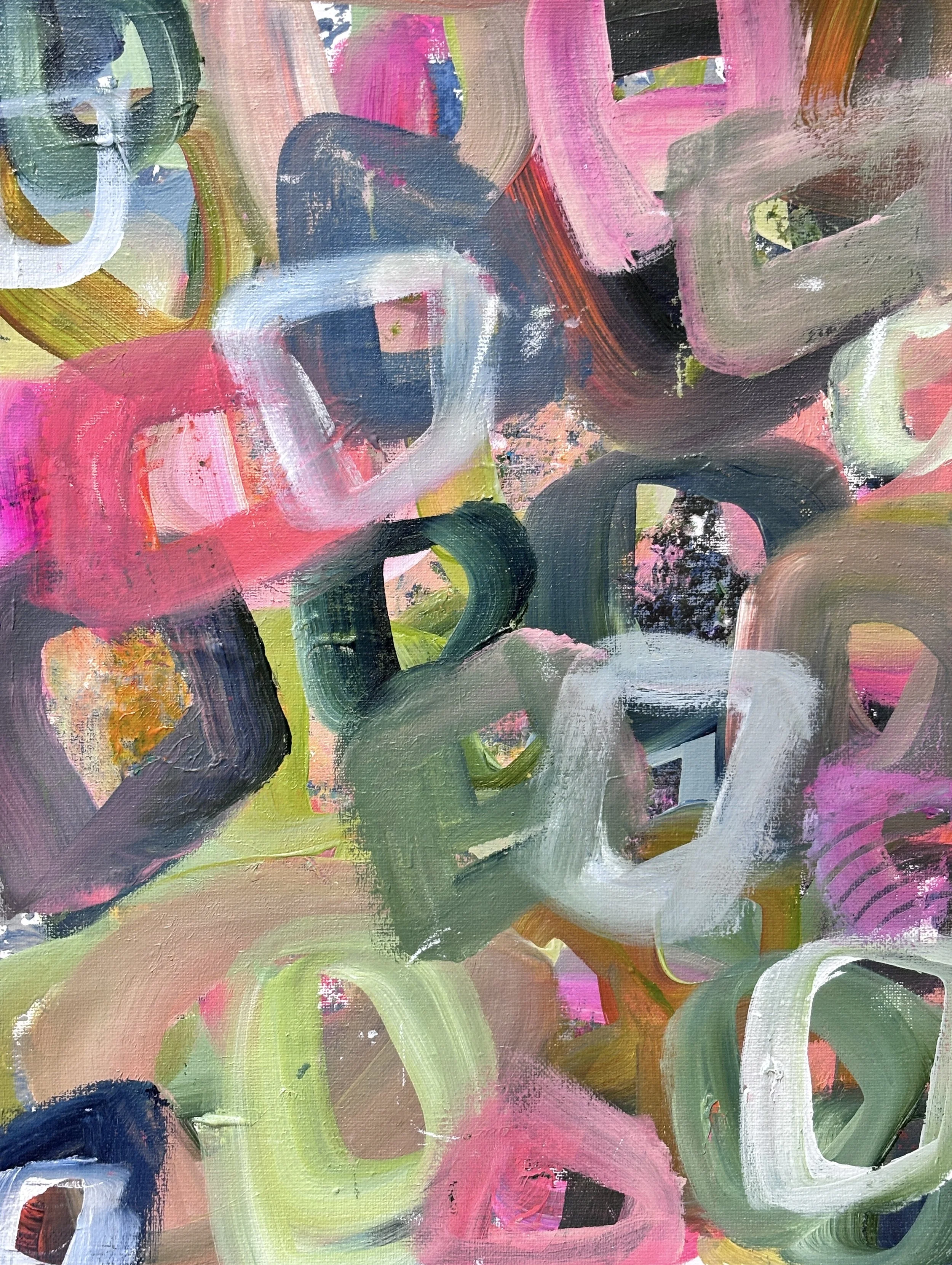 Not the breeze itself, but what it does. In Fresh Breeze, loops and curves tumble across the canvas in a cascade of pink, green, and teal. Forms that suggest petals caught mid-air, shifting and overlapping, never quite settling. There is nothing still here, and nothing anxious either. Just the particular freedom of being carried.