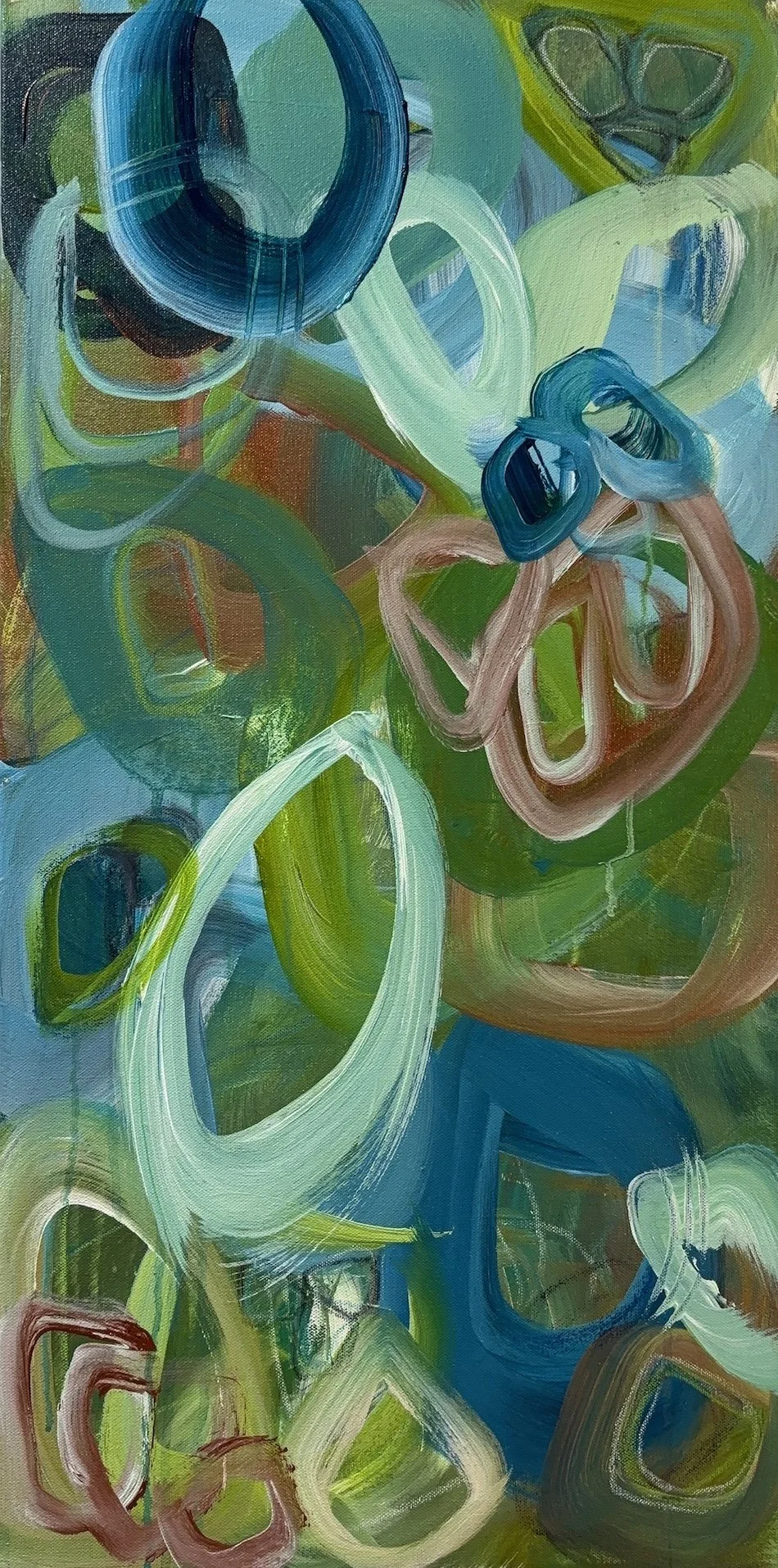 In Tangled, I worked spontaneously, layering colour, texture, and interwoven forms until the surface buzzed with life. Like undergrowth threading itself in every direction, it captures the wildness of being deep in the woods — where everything feels messy, alive, and uncontainable. There’s a tension here, but also a sense of curiosity, like the forest daring you to keep going.