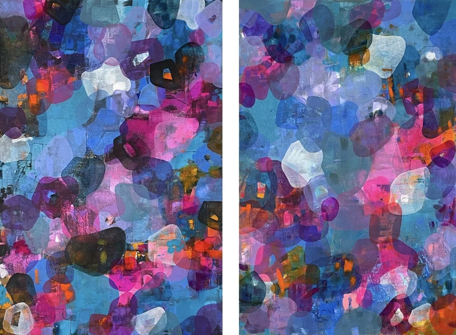 “I have long been attracted to abstract art where my imagination is inspired to discover connections for myself. What first attracted me to this artwork were the overall effect and the implied motion in the colours and varying shapes.I also loved how the two paintings "spoke" to each other and created one unit out of two.